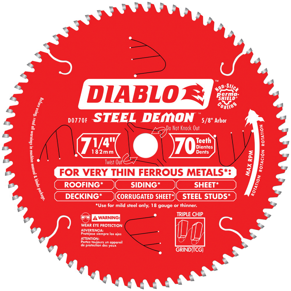 Diablo® Circular Saw Blade, Diamond Knockout Laser Cut, 7-1/4 in Diameter, 0.051 in Thickness, 5/8 in Arbor, TCG Teeth, 70 Teeth, -5 deg Tooth Angle, 5800 rpm Maximum, 2-3/8 in Cutting Depth, 0.071 in Kerf, Carbide Cutting Edge, Carbide Blade, Applicable Materials: Roofing, Siding, Sheet, Decking, Corrugated Sheet, Mild Steel, Steel Stud and Ferrous Metal