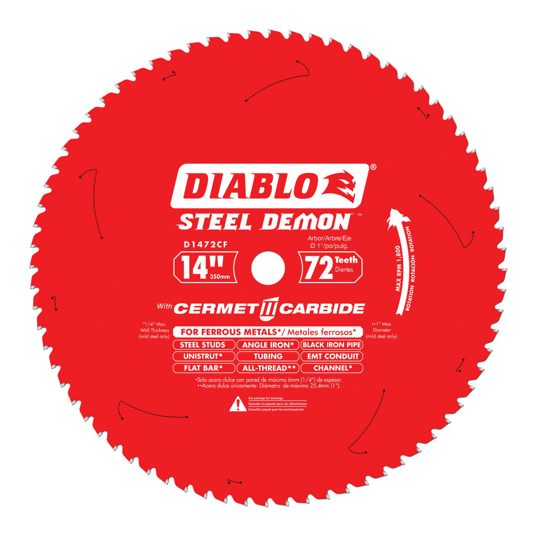 Diablo® Circular Saw Blade, Series: Steel Demon®, 14 in Diameter, 0.071 in Thickness, 1 in Arbor, TCG Teeth, 72 Teeth, 0 deg Tooth Angle, 1800 rpm Maximum, 0.083 in Kerf, Cermet Cutting Edge, Carbide Blade, Perma-SHIELD® Coated, Applicable Materials: Steel, Stainless Steel and Iron
