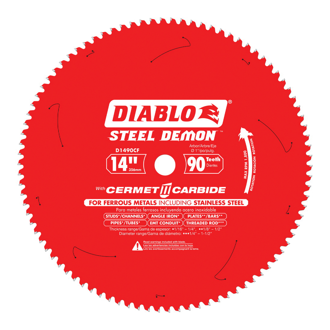 Diablo® Circular Saw Blade, Series: Steel Demon®, 14 in Diameter, 0.071 in Thickness, 1 in Arbor, TCG Teeth, 90 Teeth, 0 deg Tooth Angle, 1800 rpm Maximum, 0.083 in Kerf, Cermet Cutting Edge, Carbide Blade, Perma-SHIELD® Coated, Applicable Materials: Steel, Stainless Steel and Iron