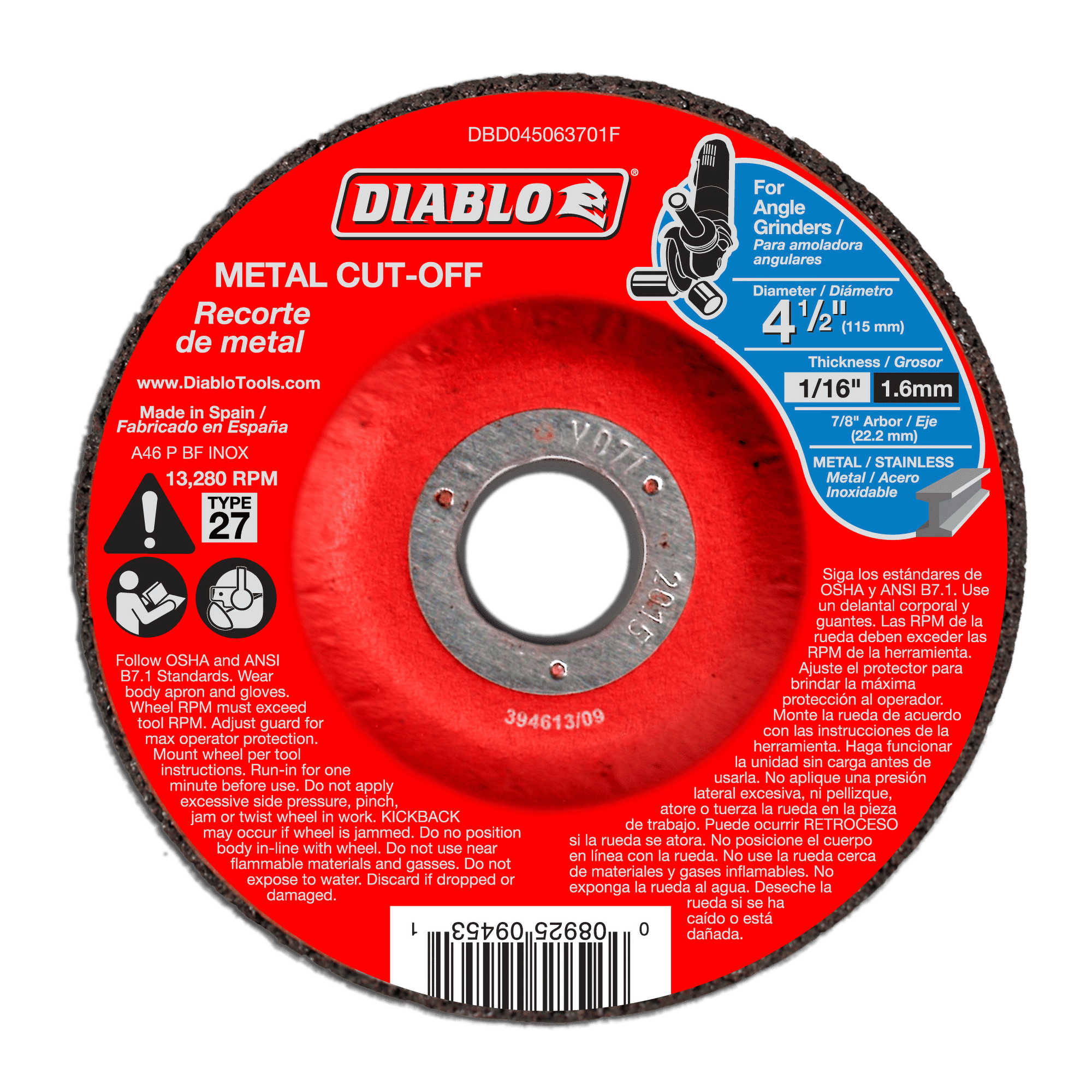 Diablo®, DBD045063701F, Cut-Off Disc, Medium Duty, 4-1/2 in Wheel Diameter, 1/16 in Wheel, 7/8 in Center Hole, 36 Grit, Coarse Grade, Aluminum Oxide Abrasive, 13280 rpm Maximum, Applicable Materials: Rebar, Angle Iron, Cast Iron, Steel Bar, Stainless Steel, Wheel Type Number: 27, Reinforced: Yes