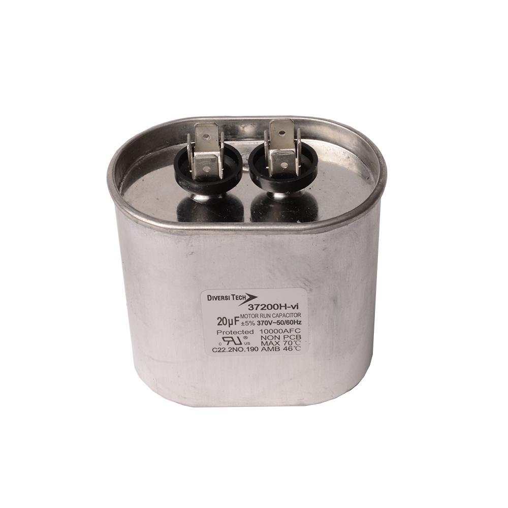Diversitech Motor Run Capacitor, Single, 20 uF, 370 VAC, Oval, Metal Case, 50/60 Hz, +/- 5% Tolerance, 2.91 in H Case, Import