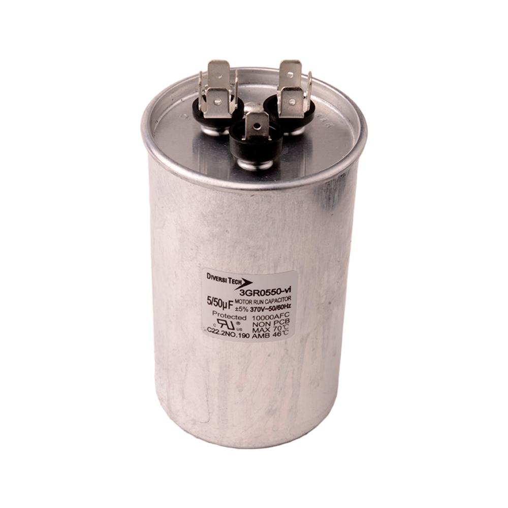 This DiversiTech® 3GR0550 Motor Run Capacitor, Round, 50+5µF, 370 volts dual capacitance round, metal can capacitors are designed for continuous run. Guaranteed for 10,000 hours of life under normal operating conditions. Operating life of 94% at 60,000 hours Used for heavy duty continuous applications such as furnace blower and Conductors fan motors.