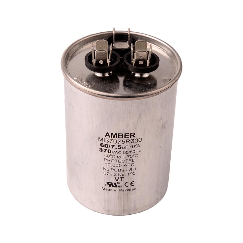 Diversitech Motor Run Capacitor, Dual, 60/7.5 uF, 370 VAC, Round, Metal Case, 50/60 Hz, +/-5% Tolerance, 3.4 in H Case, Silver, Import