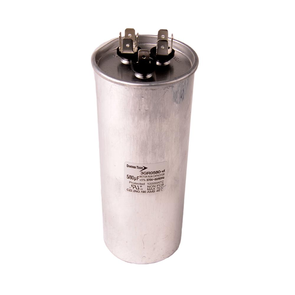 Diversitech Motor Run Capacitor, Dual, 80/5 uF, 370 VAC, Round, Metal Case, 50/60 Hz, +/-5% Tolerance, 5.96 in H Case, Silver, Import