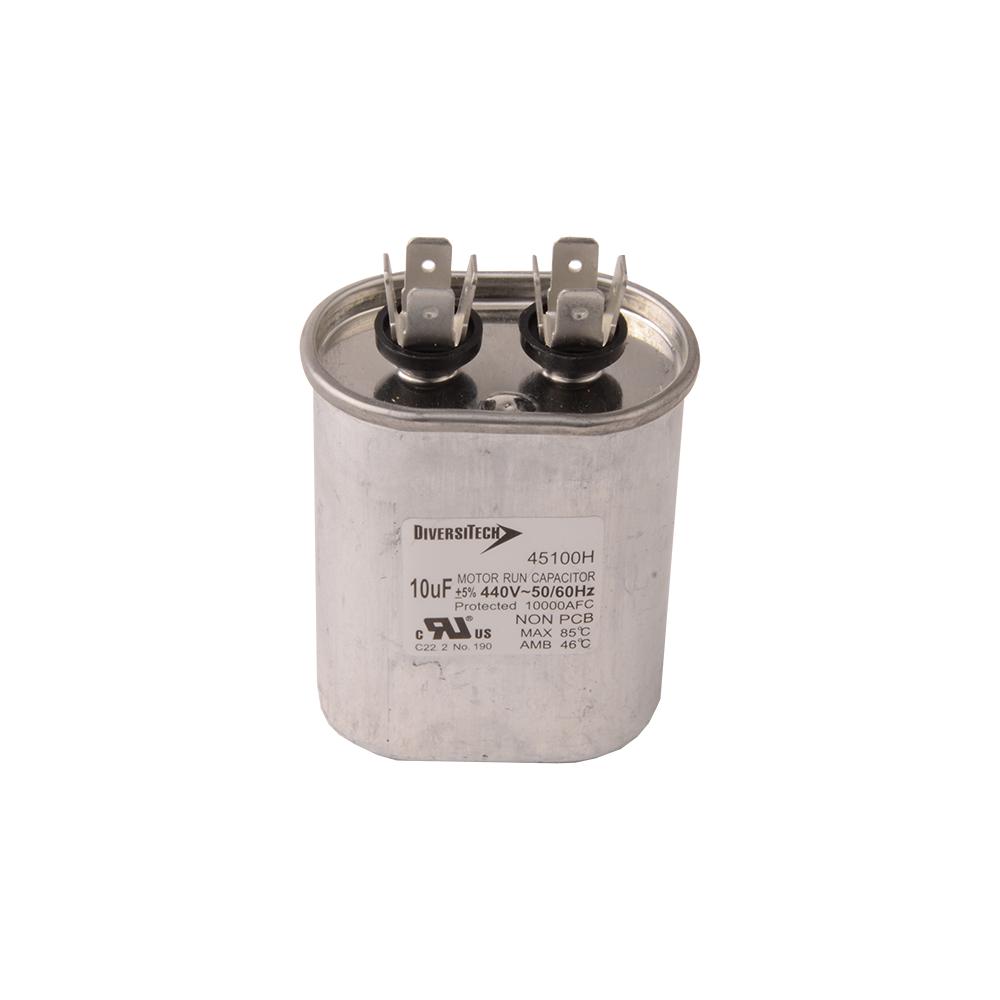 Diversitech Motor Run Capacitor, Single, 10 uF, 440 VAC, Oval, Metal Case, 50/60 Hz, +/- 5% Tolerance, 2.56 in H Case, Import