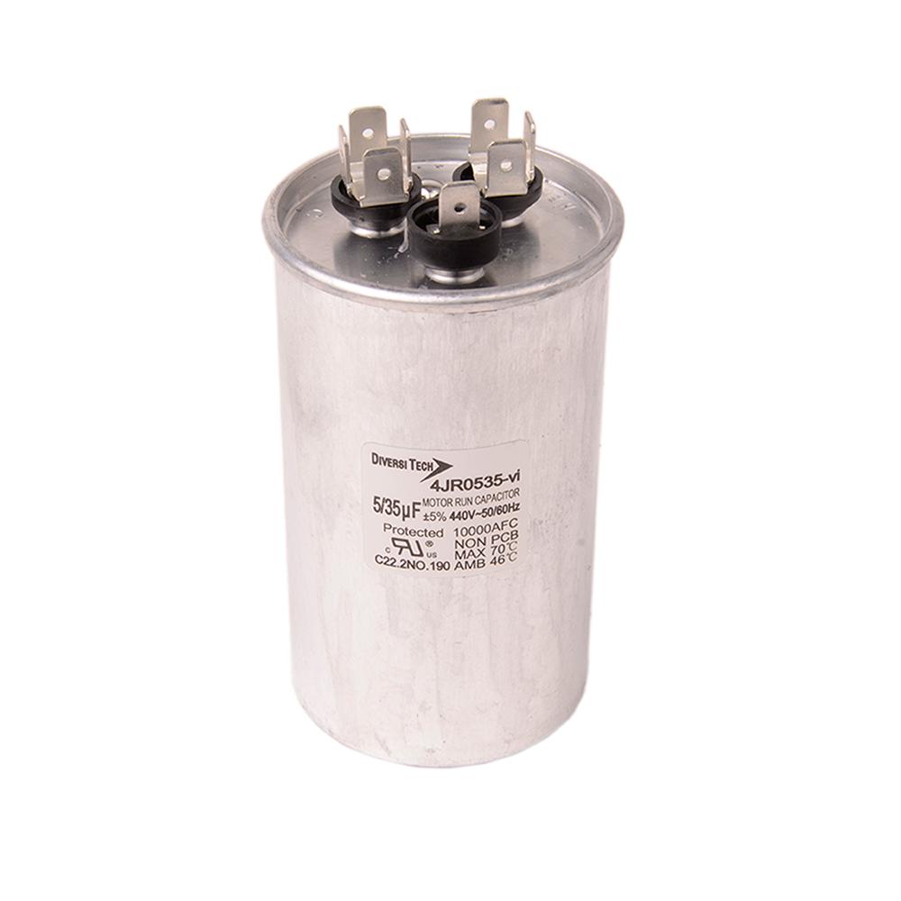 Diversitech Motor Run Capacitor, Dual, 35/5 uF, 400 VAC, Round, Metal Case, 50/60 Hz, +/- 5% Tolerance, 3.74 in H Case, Import