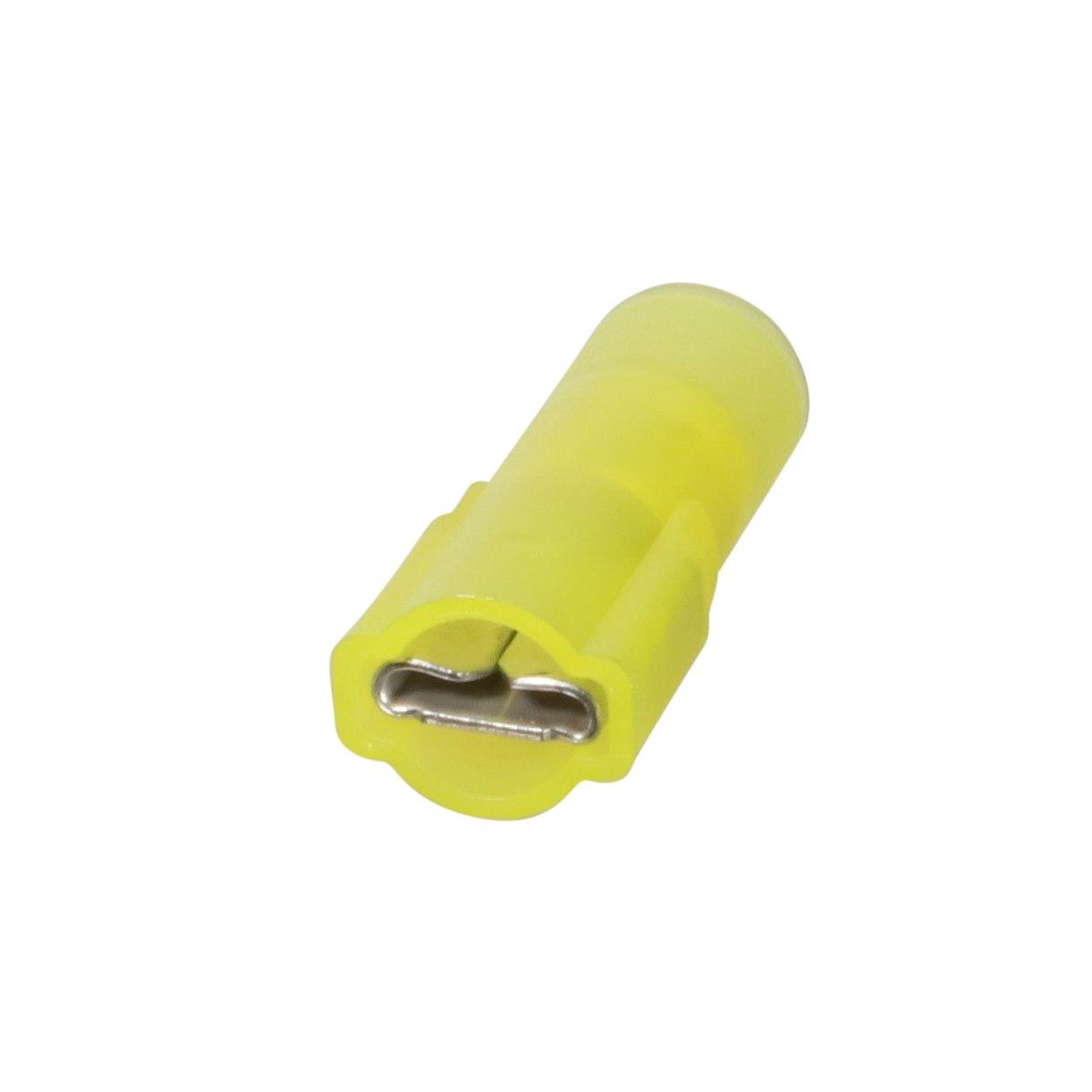 The DiversiTech® DXF3C Female Fully Insulated Disconnect, 12-10 wire gauge, pack of 100 butted seam construction prevents splitting under maximum pressure. Internal barrel serrations grip wires tightly to resist pull-out and reduce electrical resistance. Shouldered barrel insulation quickly positions terminal for proper crimping.