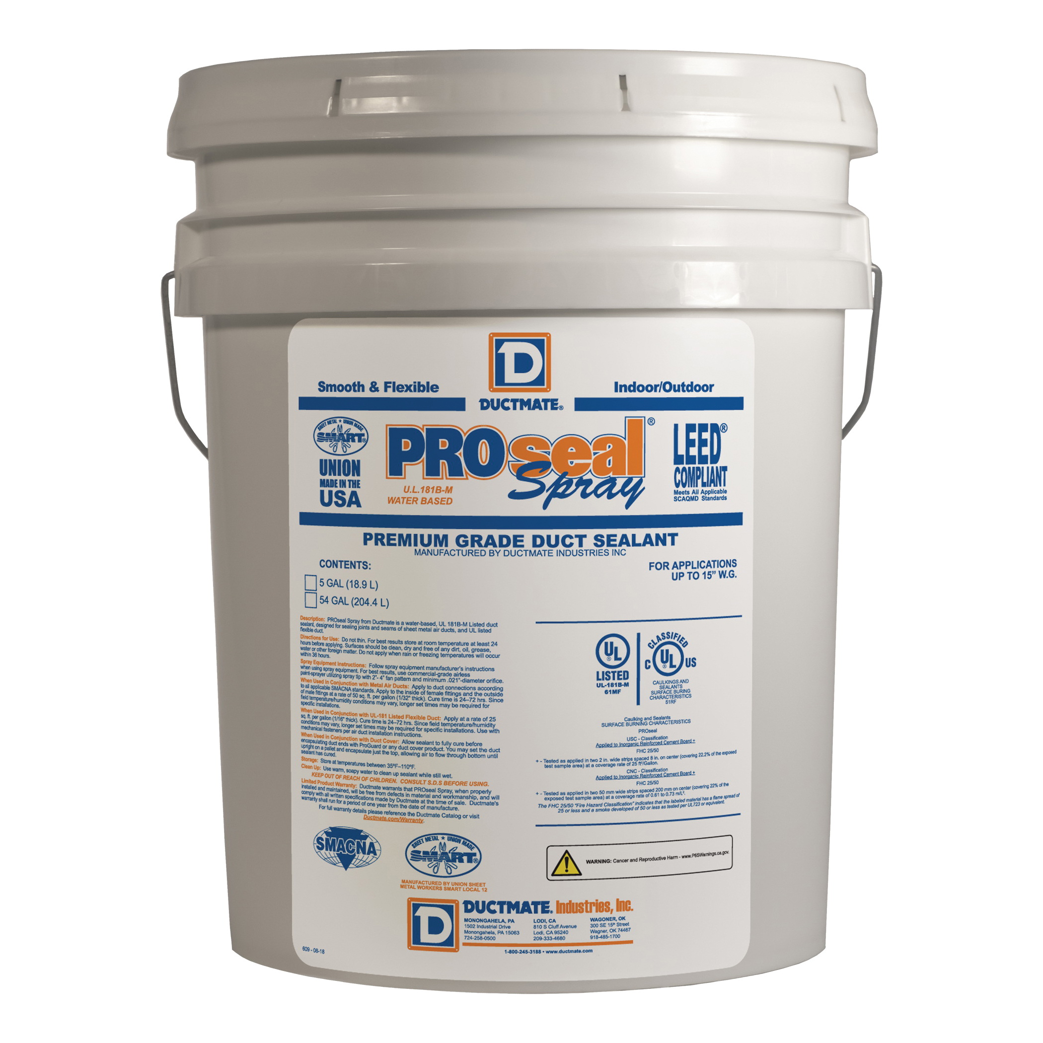 Ductmate® PROseal® Spray Duct Sealant, High Velocity Sprayable, Pail Container, 5 gal Container, Water Base, 1 hr Drying, 24 to 72 hr Curing, Gray, 0 to 200 deg F, 1.3 g/L VOC, Applicable Materials: Metal