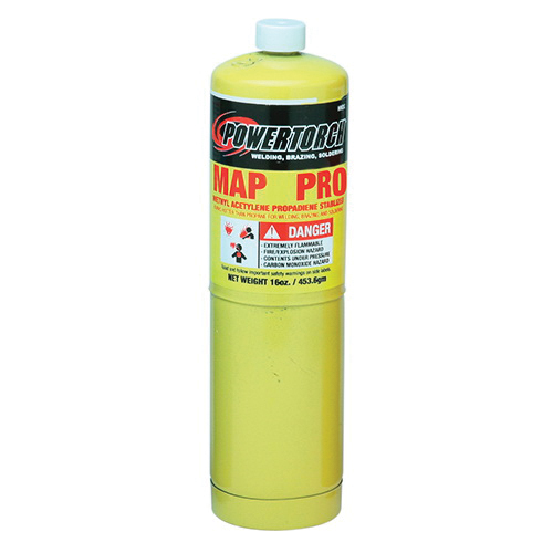 MAP-Pro™ 14.1 oz hand torch cylinder contains premium fuel suited for a variety of job site projects. MAP-Pro™ works faster and more efficiently with a higher burn temperature than standard propane. It is packaged 12 cylinders per case. This tank works well with Harris® air-fuel hand torches.