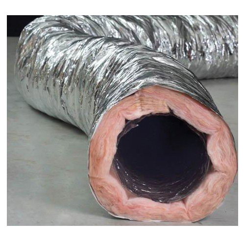 MHP-50 (50 ft length) flexible duct is constructed with a spring steel wire helix, encapsulated in a 2 ply, air-tight inner core. Fiberglass insulation choices of R4.2 and R6 encompass the core and a unique metalized, reinforced vapor barrier surrounds the entire duct.