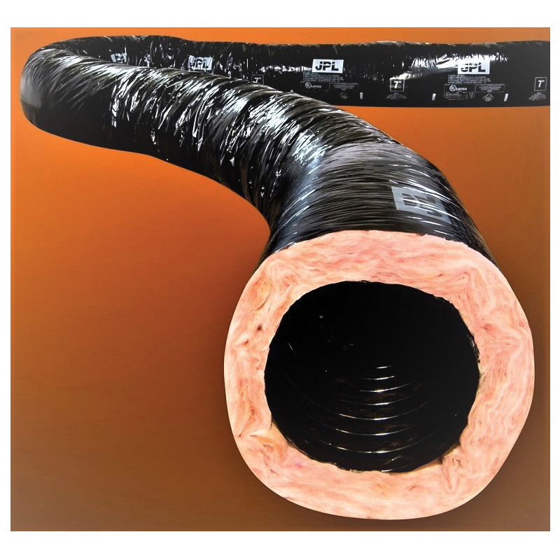 JPL® Flexible Air Duct, Insulated, Series: PR-50, 8 in ID, 50 ft Length, 5000 fpm Flow Rate, R6 Insulation Value, 0.19 perm Vapor Transmission, -1 to 6 in-WG Pressure, 0 to 200 deg F, Fiberglass/Polyethylene/Pigmented Polyester, Black, Domestic