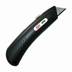 Die-cast heavy duty model comes complete with 3 double point blades. Safe, easy to operate, thumb action mechanism on top facilitates three cutting positions - fully extended, partially extended for carton opening and intermediate.