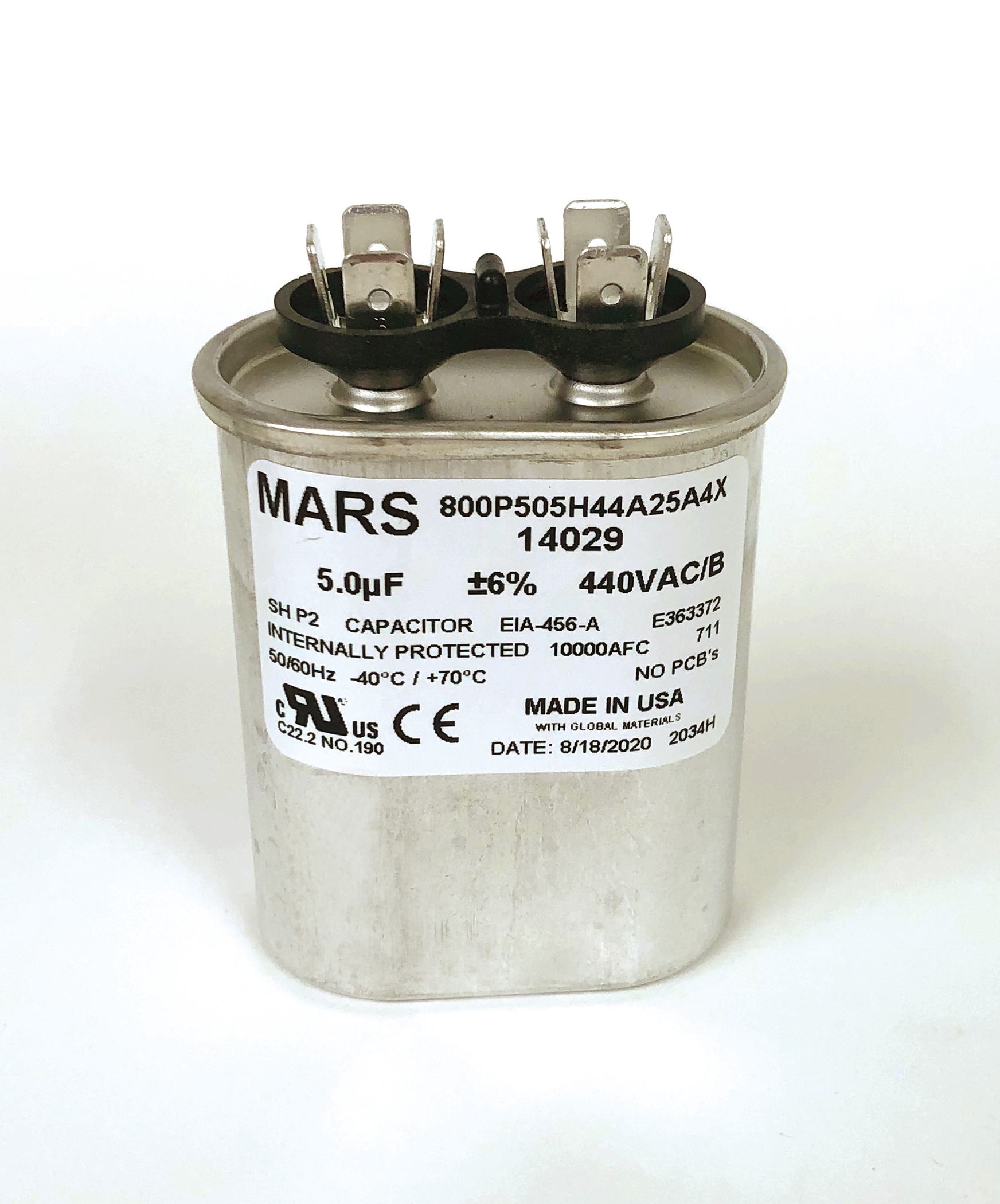 Mars®, 14029, Capacitor, Single Section, 5 uF Capacitance, 440, 370 VAC, Oval Shape, Aluminum Case, Specifications: -40 to 70 deg C, 50, 60 Hz, 3.13 in H x 2.16 in W Dimensions, Domestic