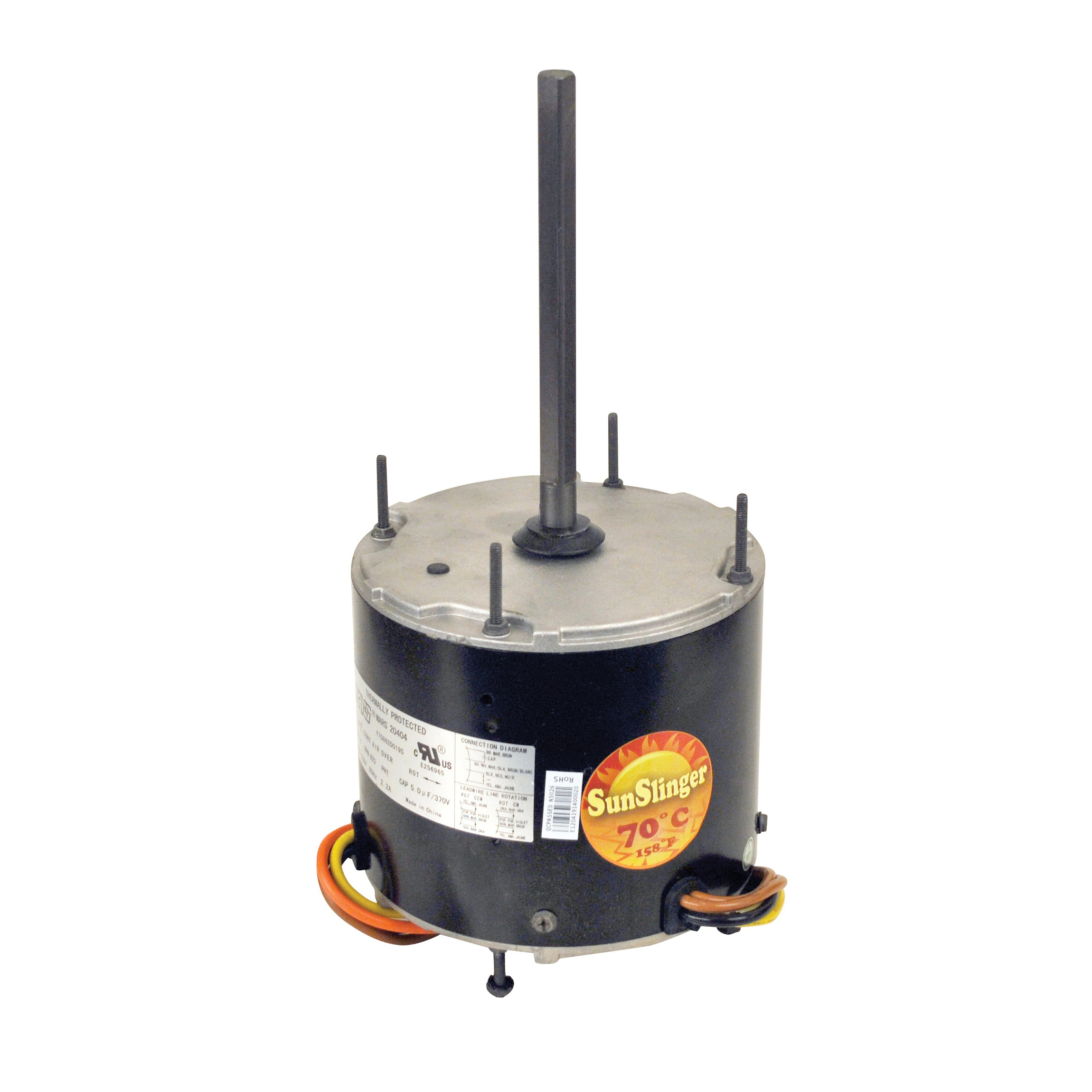 Mars® 70 deg C SunSlinger totally enclosed condenser fan motors are designed for either vertical shaft-up or shaft-down applications in a variety of ambient conditions. Shell and end shields are enclosed for weather protection. A weep hole is provided in each end shield to allow condensate to drain. All of these motors are suitable for air conditioning or heat pump applications.
