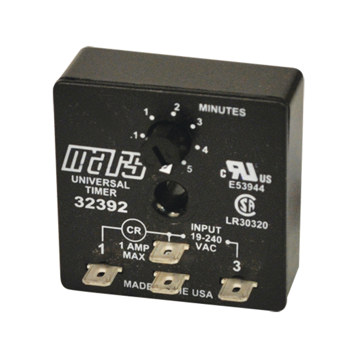 MARS solid state delay on break timers are designed to prevent short cycling of air conditioning, refrigeration and heat pump compressors. Upon application of power the load is energized. When the thermostat opens, or if there is a momentary loss of power, the load is de-energized and the delay period begins. The compressor will not start again during the delay period. MARS number 32392 is a versatile three wire timer that features adjustable timing and can be used with any voltage from 19 thru 240 VAC, 50 or 60 Hz.