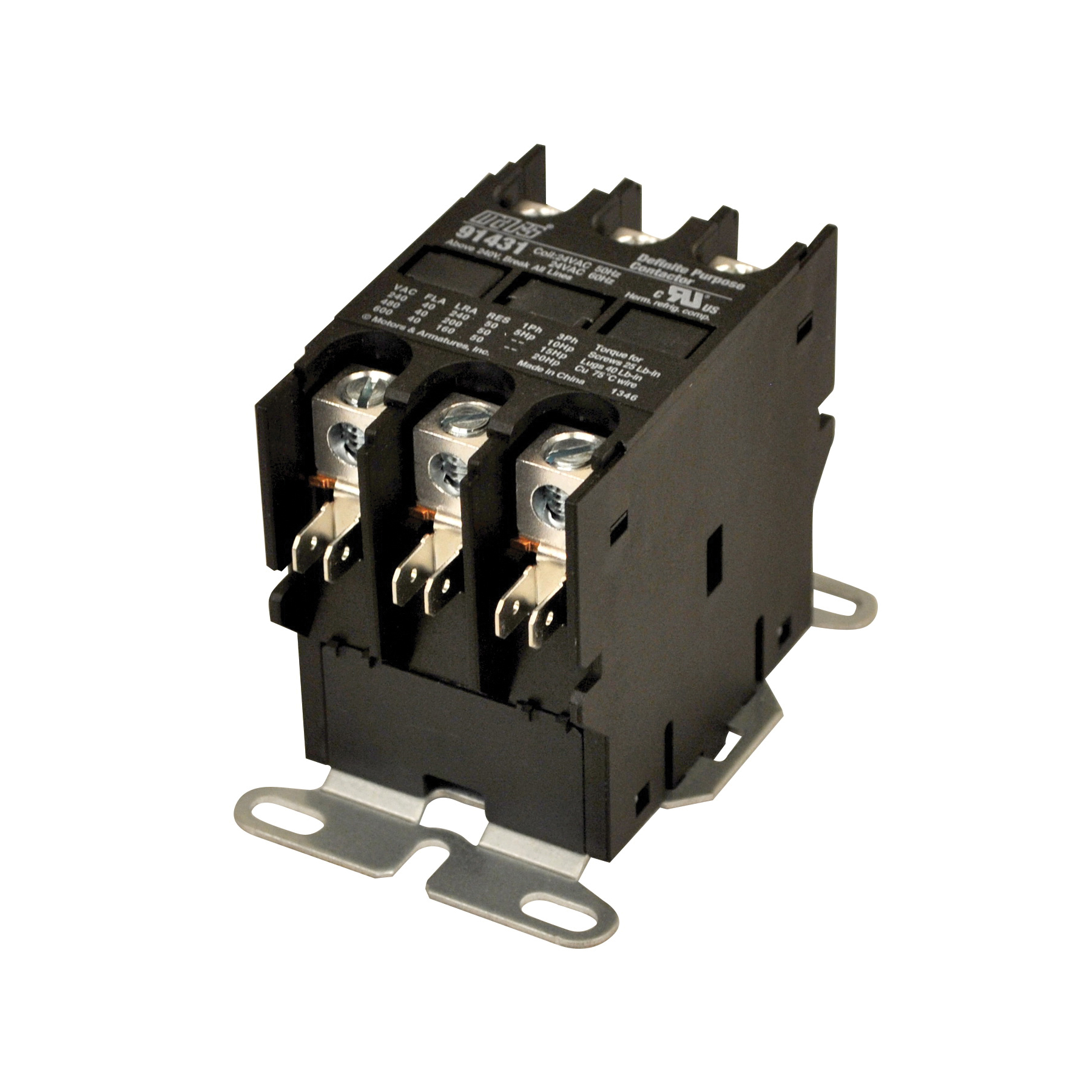 Mars® definite purpose contactors are designed for use on refrigeration, air conditioning, and electric heating systems. They are available in one pole with shunt (one and one half pole) configurations, from 30 thru 40 A. Mars® brand definite purpose contactors are also available in 2-pole models (30 and 40 A) and 3-pole models (30 through 75 A). The universal mounting base allows replacement of most contactor brands. Straight-thru wiring and small size speeds installation.