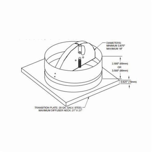 METAL-FAB® Radiation Butterfly Damper, Series: MRCD, 8 in Damper, Round, 22 ga, Ceiling Mount, Steel, Galvanized, 21 in L x 21 in W x 1/8 in THK