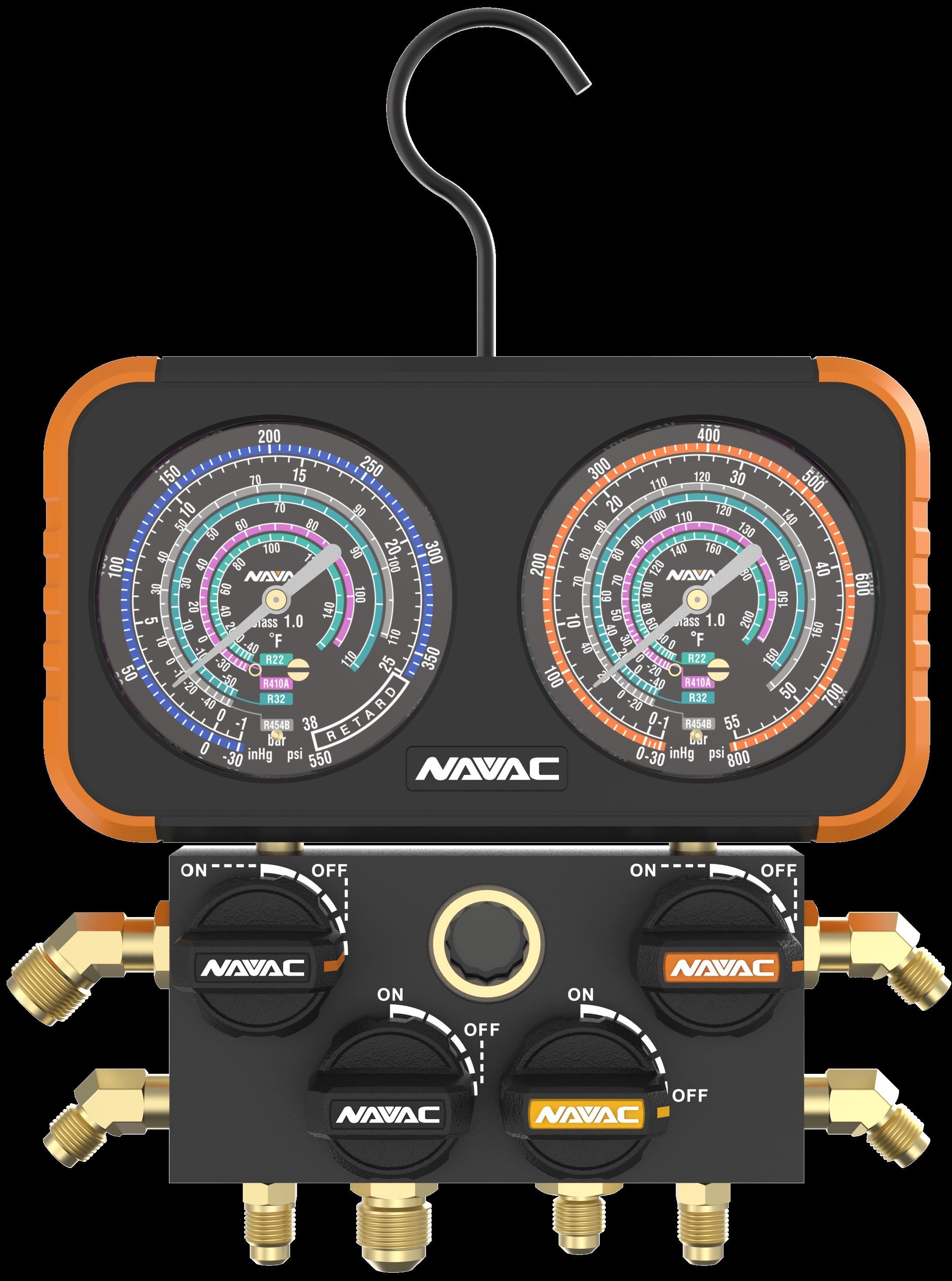 Navac, N4A4H, Manifold Guage, 4-Valve, Specifications: -30 inHg to 800 psi Pressure Range, For Use With: R-22, R-410A, R-134A and R-404A Refrigerator, Aluminum/Rubber