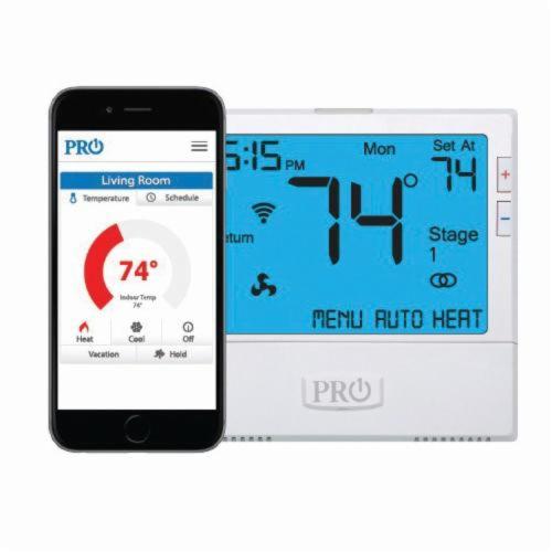 Pro1® Thermostat, Wi-Fi, Programmable Thermostat, 0.2 to 2 deg F Differential, RH, RC, C, Y, Y2, W/E, W2 G, O, B Terminal Designations, 6 Stage, 4 Stages Heat, 2 Stages Cool, 5-1-1 Days Programs per Week, 8 sq-in LCD Display, 24 VAC, Battery/Hardwired Power Source, Junction Box/Wall Mounting, Gray, 4.7 in W x 1.1 in D x 4.4 in H Dimensions, Import